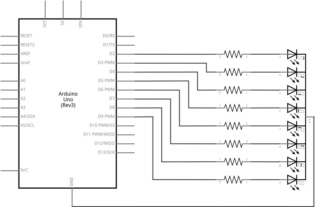 Na mikrokontroler spojite jedan sedam segmentni pokazivač. Redom uključujte segmente a,b,c,d,e,f. Neka je svaki segment uključen 300 milisekundi. Kada ciklus završi neka trčanje krene ispočetka.
