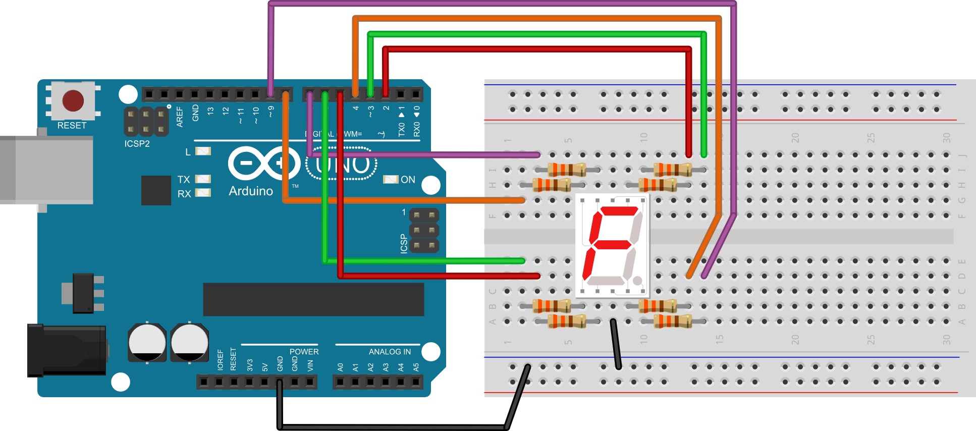int segA = 2; //definiraj seg_a = 2 int segB = 3; //definiraj seg_b = 3 int segC = 4; //definiraj seg_c = 4 int segD = 5; //definiraj seg_d = 5 int segE = 6; //definiraj seg_e = 6 int segF = 7; //definiraj seg_f = 7 int segG = 8; //definiraj seg_g = 8 void setup() { pinMode(segA, OUTPUT); //postavi izvod segA kao izlazni pinMode(segB, OUTPUT); //postavi izvod segB kao izlazni pinMode(segC, OUTPUT); //postavi izvod segC kao izlazni pinMode(segD, OUTPUT); //postavi izvod segD kao izlazni pinMode(segE, OUTPUT); //postavi izvod segE kao izlazni pinMode(segF, OUTPUT); //postavi izvod segF kao izlazni pinMode(segG, OUTPUT); //postavi izvod segG kao izlazni digitalWrite(segA, LOW); //isključi a segment - početno stanje digitalWrite(segB, LOW); //isključi b segment - početno stanje digitalWrite(segC, LOW); //isključi c segment - početno stanje digitalWrite(segD, LOW); //isključi d segment - početno stanje digitalWrite(segE, LOW); //isključi e segment - početno stanje digitalWrite(segF, LOW); //isključi f segment - početno stanje digitalWrite(segG, LOW); //isključi g segment - početno stanje } void loop() { digitalWrite(segA, HIGH); //uključi a segment delay(300); //čekaj 300 ms digitalWrite(segA, LOW); //isključi a segment digitalWrite(segB, HIGH); //uključi b segment delay(300); //čekaj 300 ms digitalWrite(segB, LOW); //isključi b segment digitalWrite(segC, HIGH); //uključi c segment delay(300); //čekaj 300 ms digitalWrite(segC, LOW); //isključi c segment digitalWrite(segD, HIGH); //uključi d segment delay(300); //čekaj 300 ms digitalWrite(segD, LOW); //isključi d segment digitalWrite(segE, HIGH); //uključi e segment delay(300); //čekaj 300 ms digitalWrite(segE, LOW); //isključi e segment digitalWrite(segF, HIGH); //uključi f segment delay(300); //čekaj 300 ms digitalWrite(segF, LOW); //isključi f segment digitalWrite(segG, HIGH); //uključi g segment delay(300); //čekaj 300 ms digitalWrite(segG, LOW); //isključi g segment }