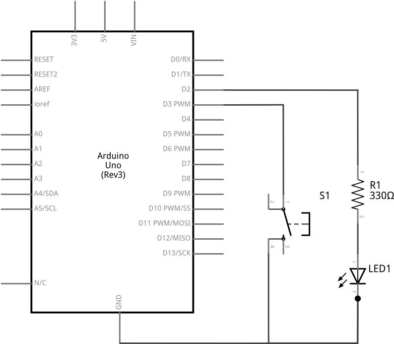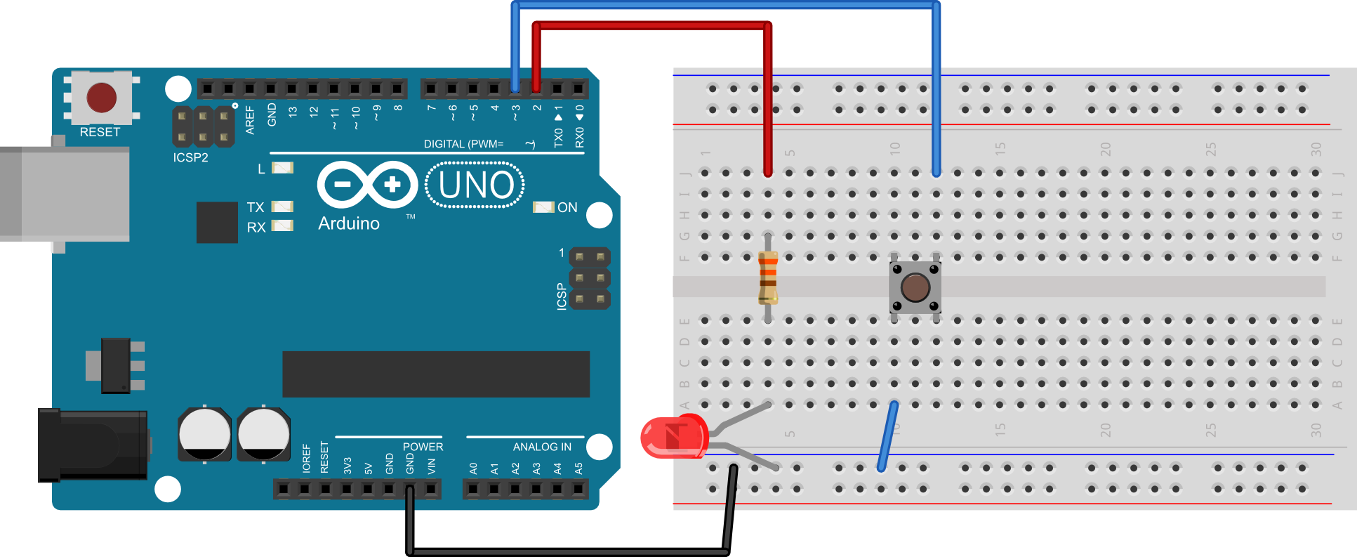 int led = 2; //definiraj led = 2 int tipkalo = 3; //definiraj tipkalo = 3 int stanje = LOW; //definiraj varijablu stanje void setup() { pinMode(led, OUTPUT); //postavi izvod led kao izlazni pinMode(tipkalo, INPUT_PULLUP); //postavi izvod tipkalo1 kao ulazni digitalWrite(led, LOW); //isključi led diodu - početno stanje } void loop() { if(digitalRead(tipkalo)==LOW){ //ako je pritisnuto tipkalo if(stanje==LOW){ //ako je stanje LOW stanje=HIGH; //postavi stanje u HIGH } else { //inače stanje=LOW; //postavi stanje u HIGH } digitalWrite(led, stanje); //postavi izvod led u stanje "stanje" } }