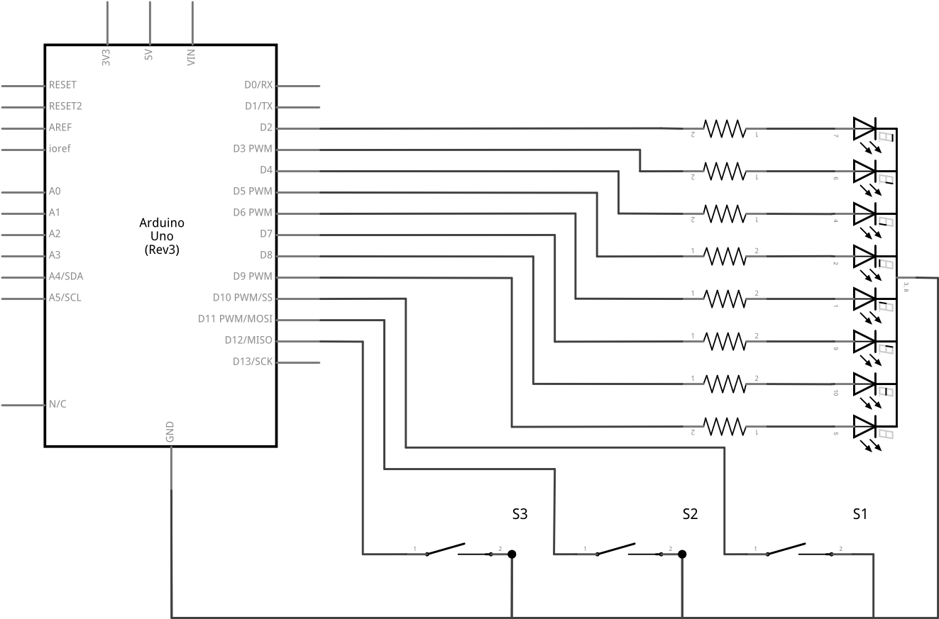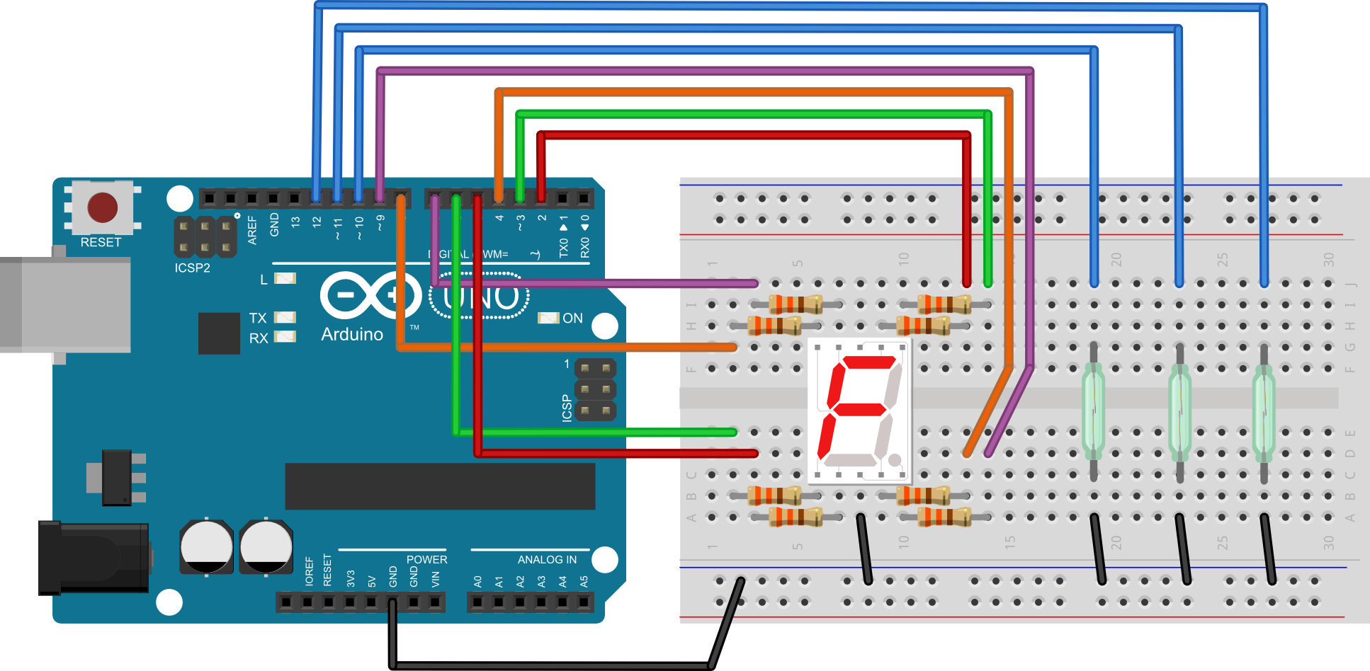 int segA = 2; //definiraj segA = 2 int segB = 3; //definiraj segB = 3 int segC = 4; //definiraj segC = 4 int segD = 5; //definiraj segD = 5 int segE = 6; //definiraj segE = 6 int segF = 7; //definiraj segF = 7 int segG = 8; //definiraj segG = 8 int reed1 = 10; //definiraj reed1 = 9 int reed2 = 11; //definiraj reed2 = 10 int reed3 = 12; //definiraj reed3 = 11 void iskljucisvesegmente(){ digitalWrite(segA, LOW); //isključi a segment-početno stanje digitalWrite(segB, LOW); //isključi b segment-početno stanje digitalWrite(segC, LOW); //isključi c segment-početno stanje digitalWrite(segD, LOW); //isključi d segment-početno stanje digitalWrite(segE, LOW); //isključi e segment-početno stanje digitalWrite(segF, LOW); //isključi f segment-početno stanje digitalWrite(segG, LOW); //isključi g segment-početno stanje } void setup() { pinMode(segA, OUTPUT); //postavi izvod seg_a kao izlazni pinMode(segB, OUTPUT); //postavi izvod seg_b kao izlazni pinMode(segC, OUTPUT); //postavi izvod seg_c kao izlazni pinMode(segD, OUTPUT); //postavi izvod seg_d kao izlazni pinMode(segE, OUTPUT); //postavi izvod seg_e kao izlazni pinMode(segF, OUTPUT); //postavi izvod seg_f kao izlazni pinMode(segG, OUTPUT); //postavi izvod seg_g kao izlazni pinMode(reed1, INPUT_PULLUP); //postavi izvod reed1 kao ulazni pinMode(reed2, INPUT_PULLUP); //postavi izvod reed2 kao ulazni pinMode(reed3, INPUT_PULLUP); //postavi izvod reed3 kao ulazni digitalWrite(segA, LOW); //isključi a segment-početno stanje digitalWrite(segB, LOW); //isključi b segment-početno stanje digitalWrite(segC, LOW); //isključi c segment-početno stanje digitalWrite(segD, LOW); //isključi d segment-početno stanje digitalWrite(segE, LOW); //isključi e segment-početno stanje digitalWrite(segF, LOW); //isključi f segment-početno stanje digitalWrite(segG, LOW); //isključi g segment-početno stanje } void loop() { if (digitalRead(reed1)==LOW){ //ukoliko je dizalo na prizemlju iskljucisvesegmente(); digitalWrite(segA,HIGH); //prikaz slova P digitalWrite(segB,HIGH); //prikaz slova P digitalWrite(segE,HIGH); //prikaz slova P digitalWrite(segF,HIGH); //prikaz slova P digitalWrite(segG,HIGH); //prikaz slova P } else if (digitalRead(reed2)==LOW){ //ukoliko je dizalo na prvom katu iskljucisvesegmente(); digitalWrite(segB,HIGH); //prikaz broja 1 digitalWrite(segC,HIGH); //prikaz broja 1 } else if (digitalRead(reed3)==LOW){ //ukoliko je dizalo na drugom katu iskljucisvesegmente(); digitalWrite(segA,HIGH); //prikaz broja 2 digitalWrite(segB,HIGH); //prikaz broja 2 digitalWrite(segE,HIGH); //prikaz broja 2 digitalWrite(segD,HIGH); //prikaz broja 2 digitalWrite(segG,HIGH); //prikaz broja 2 } }