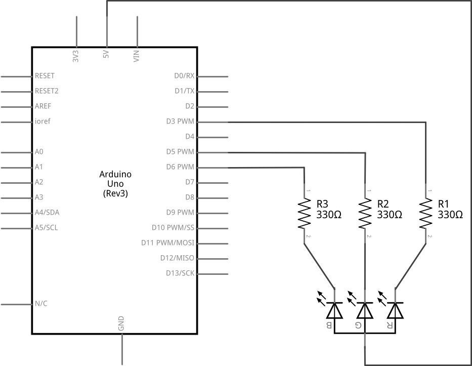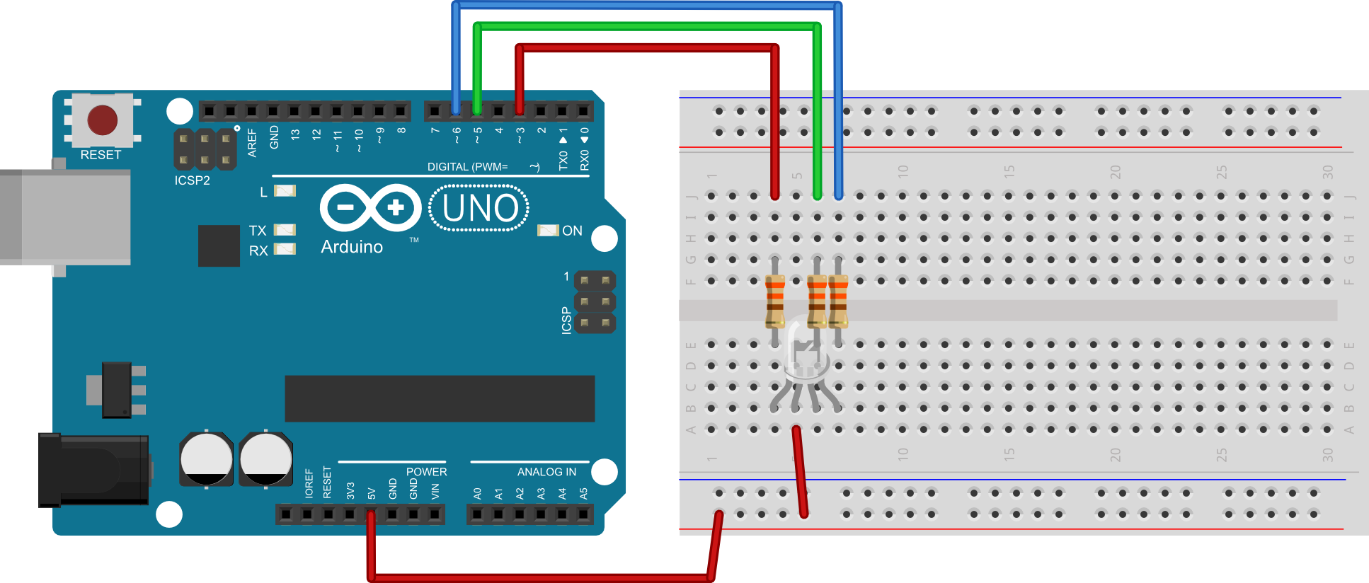 int ledR = 3; //definiraj ledR = 3 int ledG = 5; //definiraj ledG = 5 int ledB = 6; //definiraj ledB = 6 void setup() { pinMode(ledR, OUTPUT); //postavi izvod ledR kao izlazni pinMode(ledG, OUTPUT); //postavi izvod ledG kao izlazni pinMode(ledB, OUTPUT); //postavi izvod ledB kao izlazni digitalWrite(ledR, HIGH); //isključi crveni segment - početno stanje digitalWrite(ledG, HIGH); //isključi zeleni segment - početno stanje digitalWrite(ledB, HIGH); //isključi plavi segment - početno stanje } void loop() { analogWrite(ledR, 127); //uključi crveni segment na 50% analogWrite(ledG, 51); //uključi zeleni segment na 80% analogWrite(ledB, 192); //uključi plavi segment na 25% }