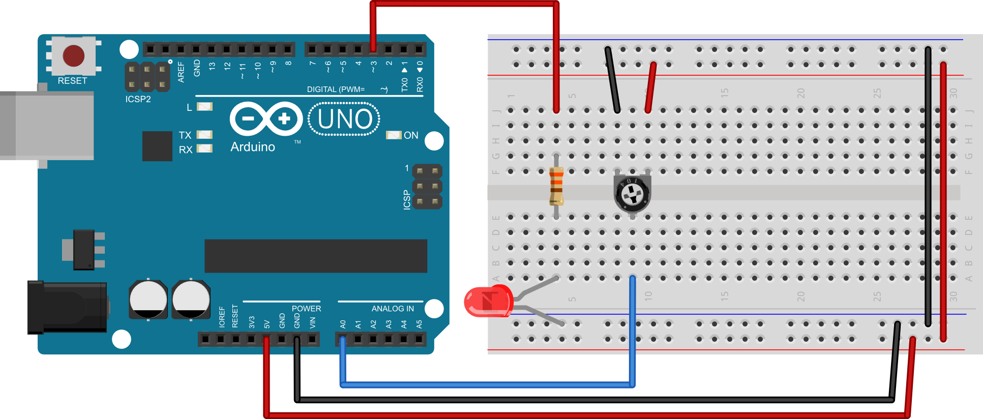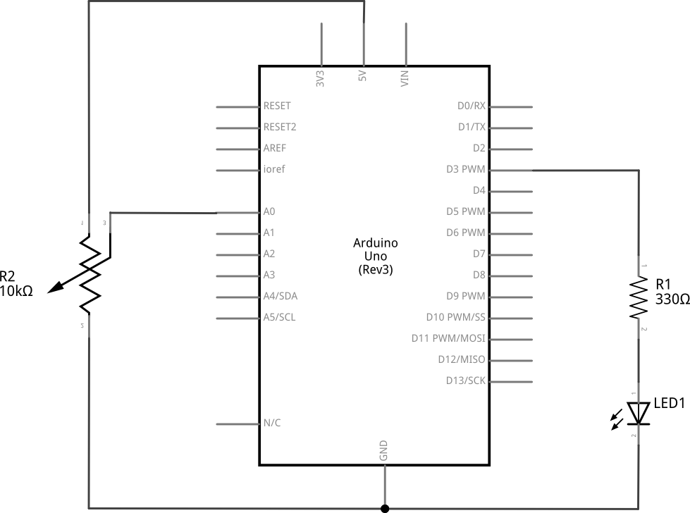 Na analogni izvod mikrokontrolera spojite srednji izvod potenciometra, a na izvod mikrokontrolera s mogućnošću pulsno-širinske modulacije spojite jednu svjetleću diodu. Napišite program koji će mijenjati jačinu svjetlosti svjetleće diode u ovisnosti o stanju analognog ulaza na kojem je spojen potenciometar. Kada je na analognom ulazu stanje 0 neka svjetleća dioda bude ugašena, a kada je na ulazu stanje 1023 neka svjetleća dioda svijetli punim sjajem. Na računalo putem serijske veze pošaljite očitanje analognog ulaza i podešenu širinu pulsa za svjetleću diodu.