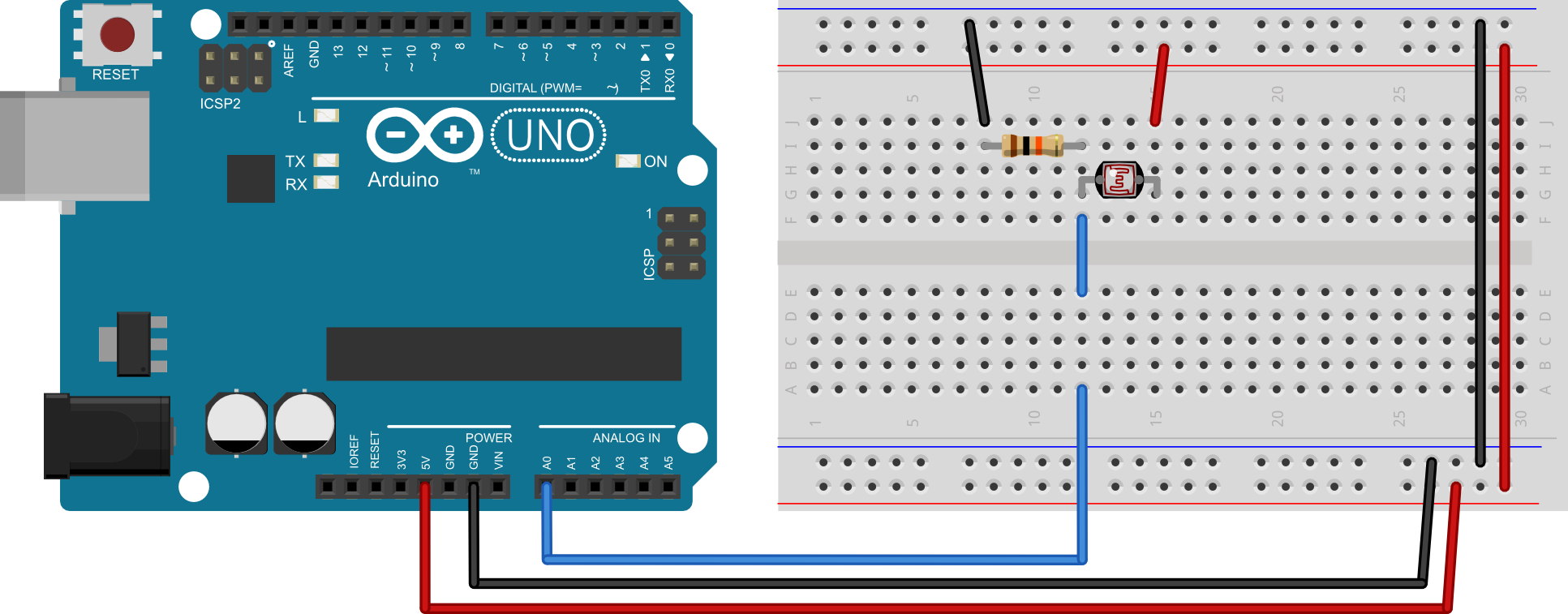 Na analogni izvod mikrokontrolera spojite fotootpornik u spoju naponskog djelila. Napišite program koji će serijskim putem na računalo svakih 100 milisekundi slati očitanje stanja analognog izvoda na koji je spojen fotootpornik. Izložite fotootpornik različitoj količini svjetlosti (zaklonite svjetlost rukom) i pogledajte dobivena mjerenja na računalu.