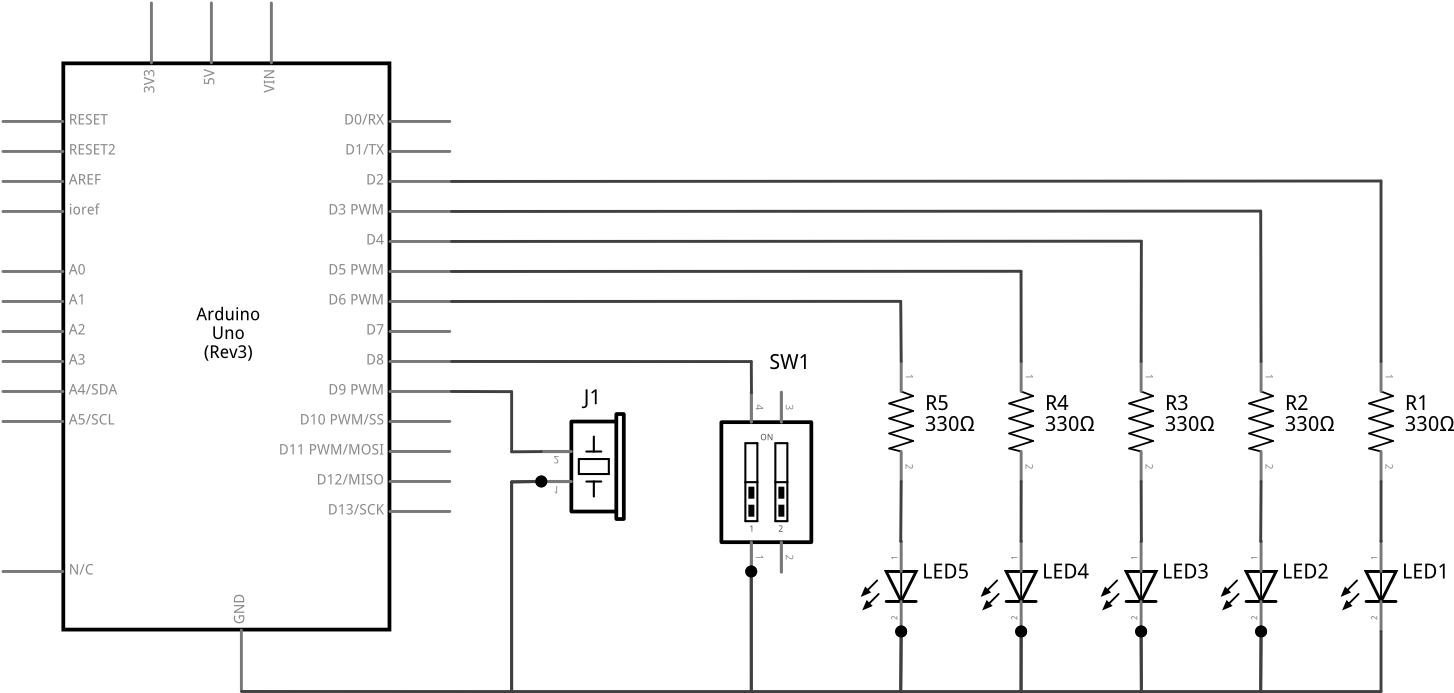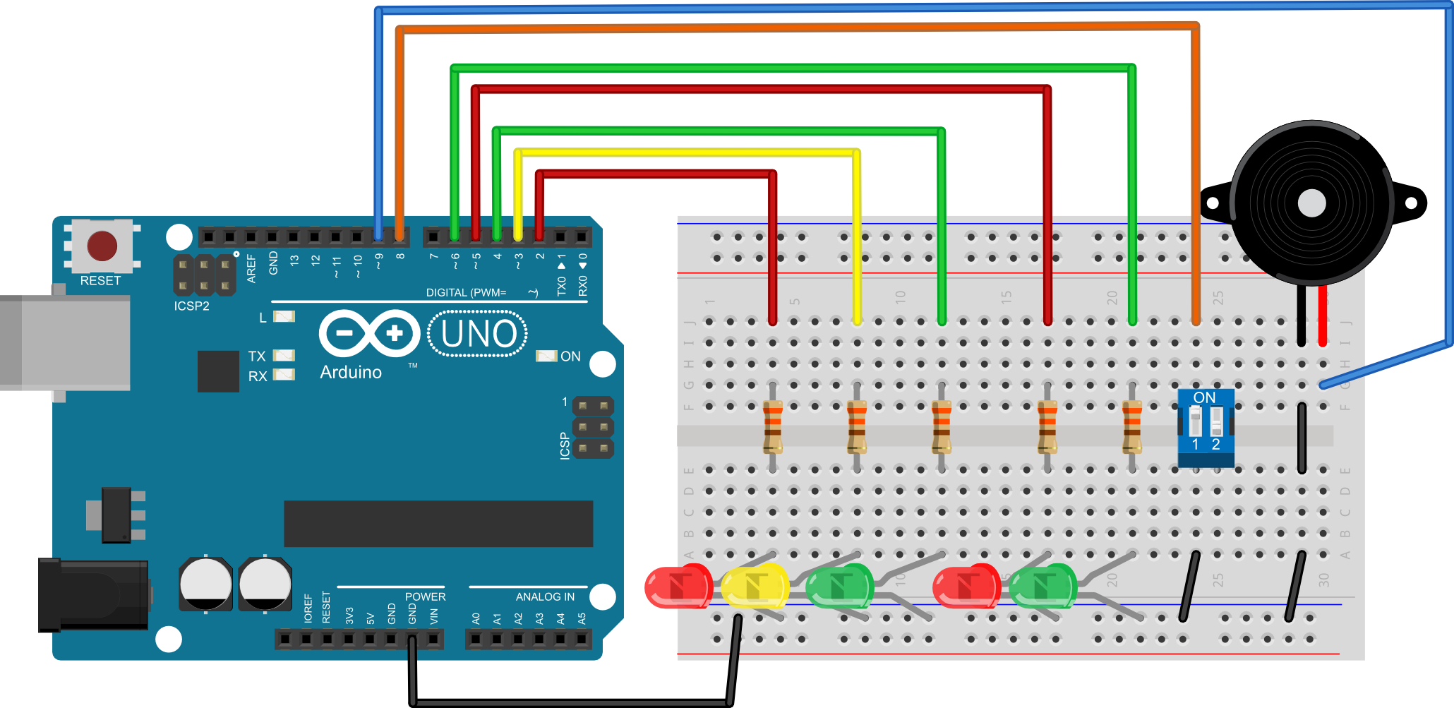 Na mikrokontroler spojite pet svjetlećih dioda, crvenu, žutu i zelenu za automobile te crvenu i zelenu za pješake. Osim dioda na mikrokontroler spojite jednu zujalicu i jednu sklopku. Napišite program koji će diode uključivati i isključivati na sljedeći način – na početku je uključeno crveno svjetlo i ono traje tri sekunde. Potom crveno i žuto svjetlo svijetle zajedno jednu sekundu. Nakon toga svijetli samo zeleno svjetlo tri sekunde. Naposljetku svijetli samo žuto svjetlo jednu sekundu. Po završetku ciklus kreće ispočetka. Zeleno svjetlo za pješake svijetli kada je na semaforu za automobile crveno svjetlo, a crveno svjetlo za pješake svijetli u svim ostalim situacijama. Dok svijetli crveno svjetlo za pješake na zujalici se generira zvuk od 1000 Hz koji traje 250 milisekundi, a nakon svakog tona postoji pauza od 250 milisekundi. Dok svijetli zeleno svjetlo za pješake na zujalici se generira zvuk od 1000 Hz koji traje 100 milisekundi, a nakon svakog tona postoji pauza od 100 milisekundi. Sklopka omogućava prebacivanje semafora u ručni rad. Kada je sklopka otvorena semafor normalno radi kako je prethodno opisano, a kada je sklopka zatvorena na semaforu za automobile blinka žuta dioda s intervalom od pola sekunde, a svjetla za pješake i zujalica su isključeni. Pri prebacivanju iz normalnog u ručni način rada semafor mora završiti ciklus i sigurno propustiti automobile i pješake na raskrižju prije početka blinkanja žute diode.